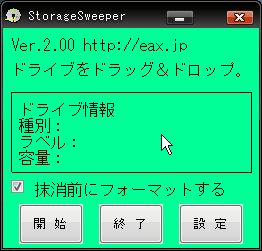 ソフトを起動するとこのような画面が出てきます。デフォルトで「抹消前にフォーマットする」にチェックが入っており、このチェックをはずすと指定ドライブの未使用領域を削除することができます。