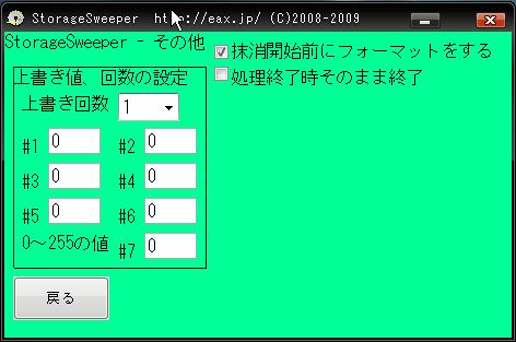 ここでは上書き回数の設定(7回まで)とそれぞれの回数で上書きする数値の設定(0~255)をすることができます。