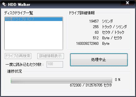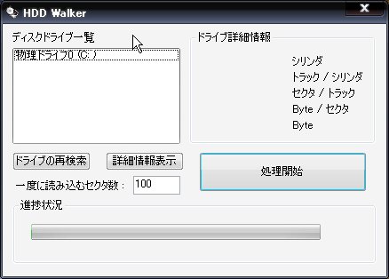 左のところには物理ドライブが表示されます。全セクタへのアクセスを開始するには「処理開始」をクリック。