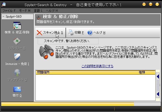 Spybot(スパイボット)は、スパイウェアの検索・削除だけではなく、レジストリの掃除もしてくれるらしいのですが、とりあえず基本のスパイウェアの駆除の仕方を書きます。