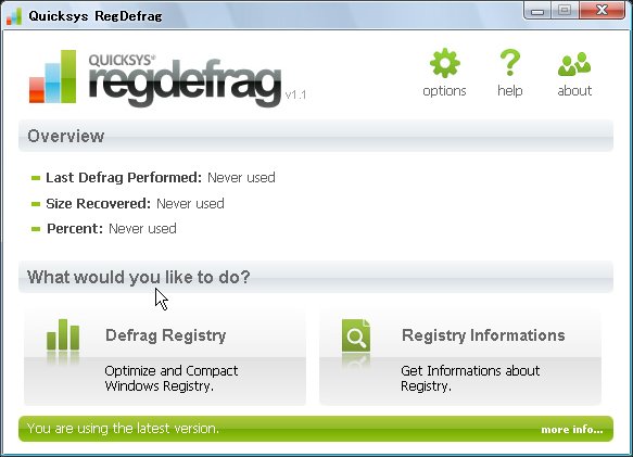 インストール後、まずこのような画面が出てきます。次に、左下の方の「Defrag Registry」をクリック。