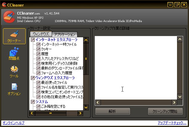 「解析」をクリックすると削除可能なゴミファイルの解析を行ないます。