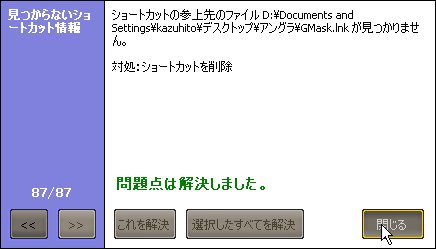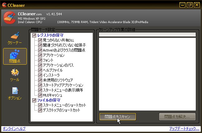 また、<問題点>のところも、同じように「問題点スキャン」をして「問題点を解決」をおすとレジストリの不具合を解決します。