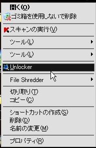 あとは消せないファイル(「ほかの人またはプログラムによって使用されています」がでてくるファイル)の上で右クリック、Unlockerという欄があるとおもうのでそれをクリック。