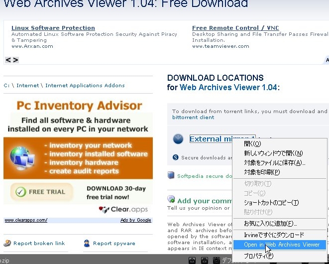 その後、圧縮ファイルのあるアドレスの上などで右クリックを押すと「Open in Web Archive Viewer」というのがあるのでそれをクリックしましょう。