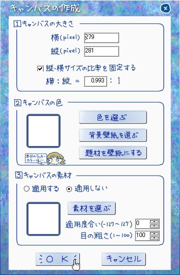 絵の大きさなどの設定画面が出ますが、弄るつもりが無いならそのまま「OK」