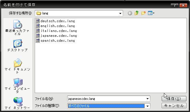 ここで保存形式がテキストになっている可能性があるので、下の画像のようにファイルの種類を「すべてのファイル」にしてから保存しましょう。(テキスト形式のままだと日本語化できないので注意!)