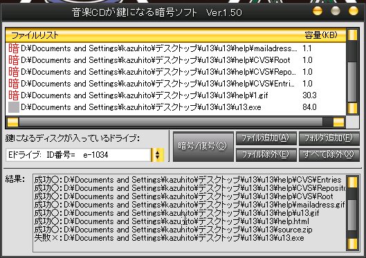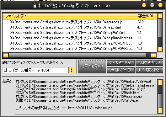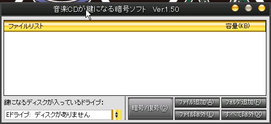 その後、キーとして使いたいCDをドライブに入れ、ソフトが認識したら「暗号/復号」をクリックすると暗号化を開始します。