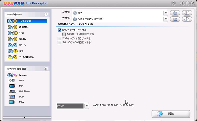 DVD読み込み完了後、「入力元」を確認したら「開始」をクリックすればコピーを開始します。
