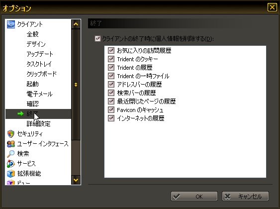 他には、終了タブではSleipnir終了ごとに一時ファイルやキャッシュを消すかどうかなどを設定できます。