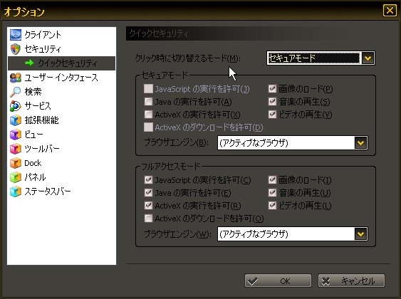 最後に下のほうにある「デフォルトモード」というやつをクリックすると、タブごとにセキュアモードに切り替えることが出来ます。セキュアモードでは、ActiveXやJavaの実行を行なわないようになるので、海外サイトとかUGサイト行くときに何らかの被害を受けることが、グンと減ります。