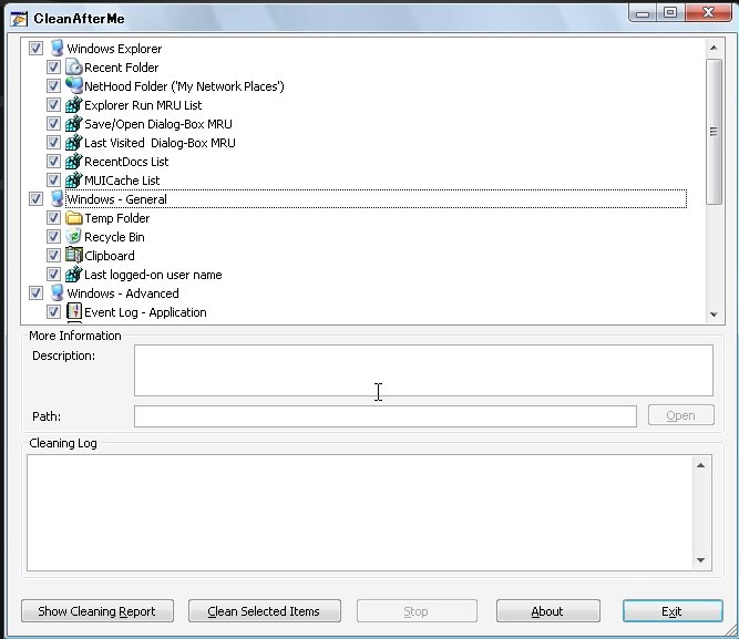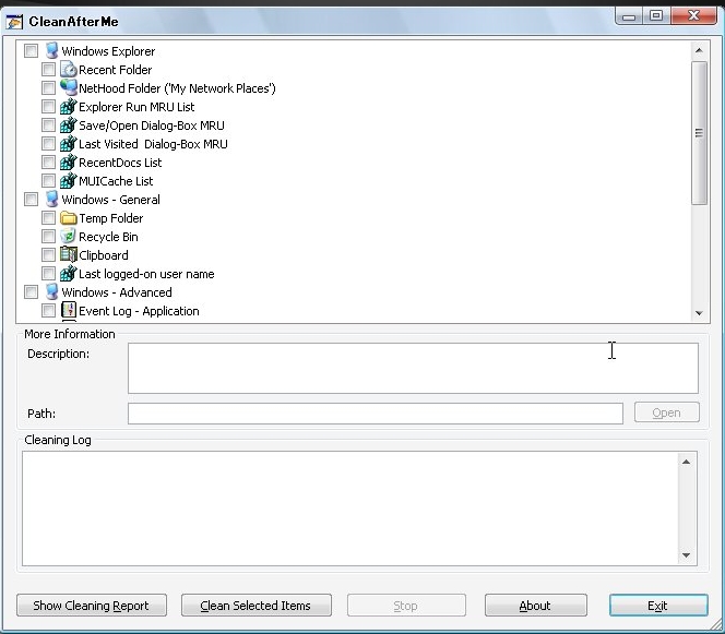 Internet Explorer のクッキー/履歴/キャッシュ/オートコンプリート/入力したURLやWindows の最近開いたファイルの履歴/テンポラリフォルダ/イベントログ、最近開いたファイルの履歴/MUIキャッシュ、などのレジストリエントリを削除、Firefox, Opera のキャッシュ/履歴/クッキー、を削除することができるソフトです。