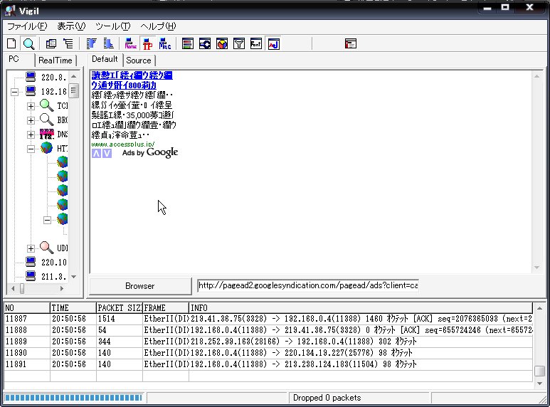 ちなみに「HTTP」をクリックしていくと、監視相手の見ているHPのパケットを解析して再構築したものが表示されたりします。他にメール等も・・・・