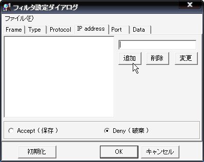 で、監視したい相手が決まっているなら「ツール」→「フィルタ」の下の画像のところで監視したい相手のIPアドレスを入力し「追加」をクリック。その後、「Accept(保存)」をクリックして「OK」を押せば監視相手を指定できます。