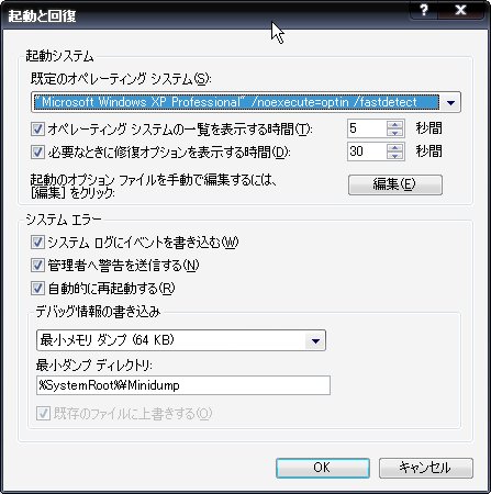 「起動と回復」という画面が出てくるので、「編集」ボタンをクリック。